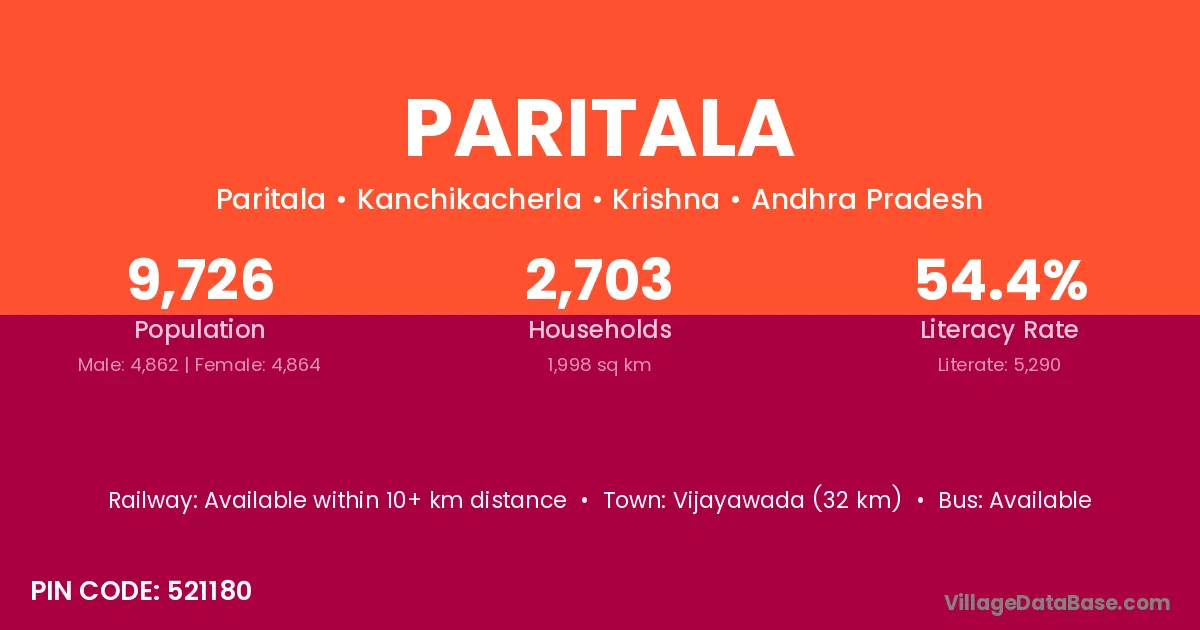 Paritala village has a total population of 9,726 people, of which 4,862 are males and 4,864 are females.