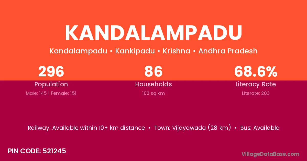 Vijayawada (28 km) is the nearest town to Kandalampadu village for major economic activities and is located approximately 28 km away.