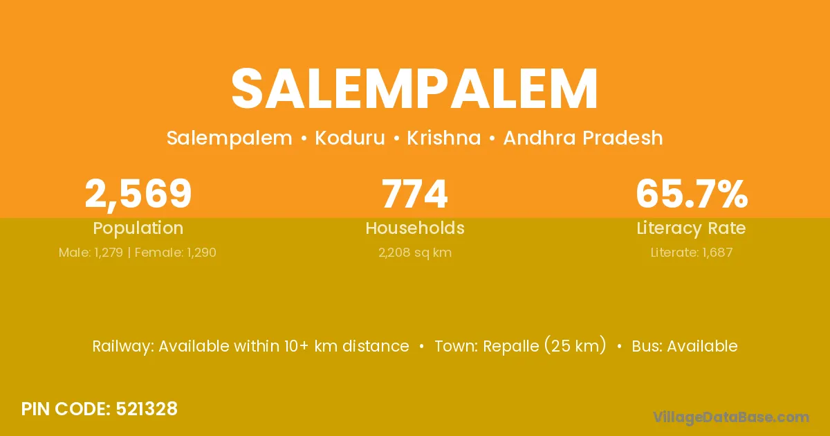 Repalle (25 km) is the nearest town to Salempalem village for major economic activities and is located approximately 25 km away.