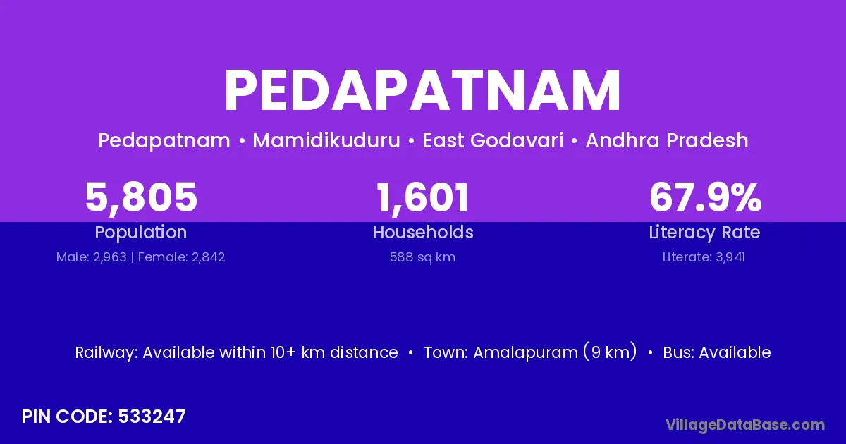 Machilipatnam (20 km) is the nearest town to Pedapatnam village for major economic activities and is located approximately 20 km away.