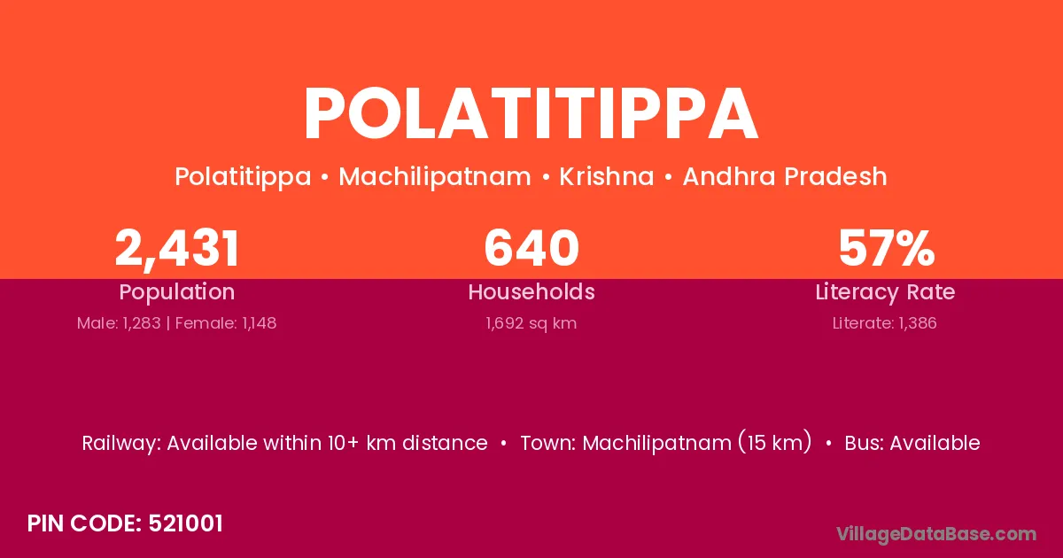 Machilipatnam (15 km) is the nearest town to Polatitippa village for major economic activities and is located approximately 15 km away.