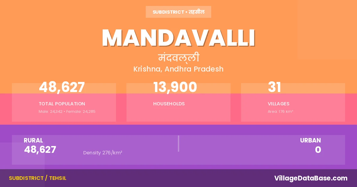 According to the 2011 census The total area of Mandavalli Mandal is 176 km², with a population of 48627 people. The population density is 276 inhabitants per square kilometre, and there are approximately 13900 houses in the sub district.