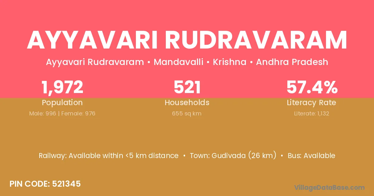 Gudivada (26 km) is the nearest town to Ayyavari Rudravaram village for major economic activities and is located approximately 26 km away.