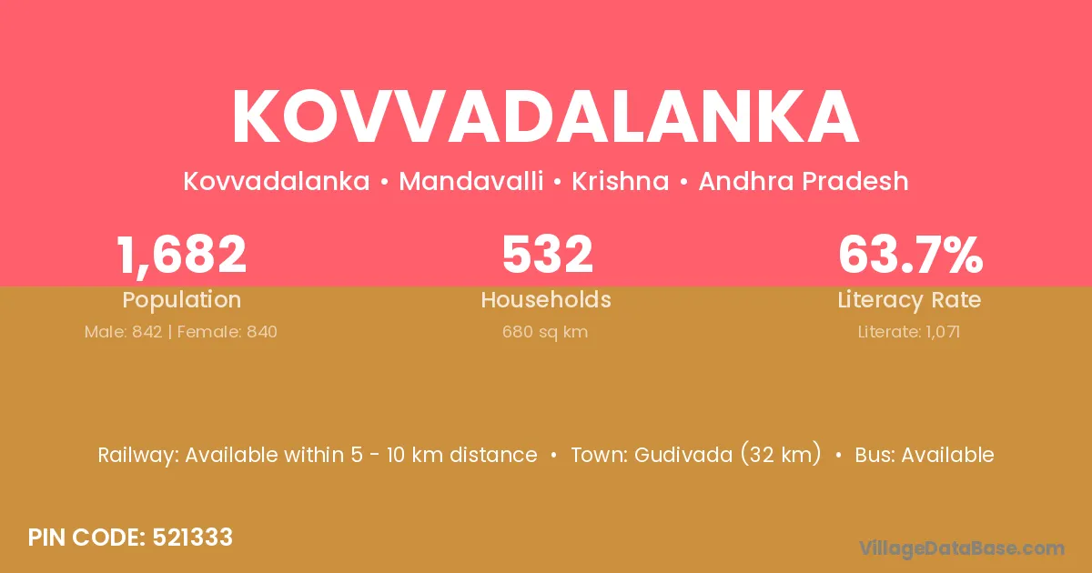 Kovvadalanka village has a total population of 1,682 people, of which 842 are males and 840 are females.