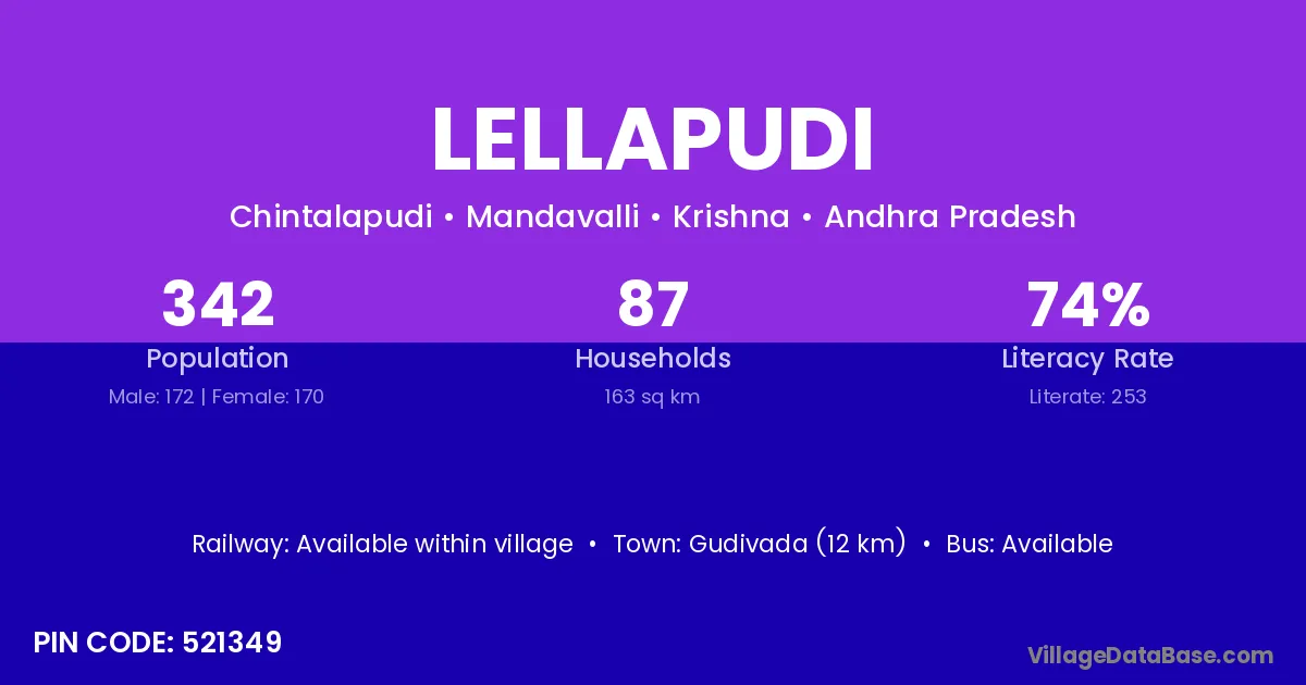 Lellapudi village has a total population of 342 people, of which 172 are males and 170 are females.