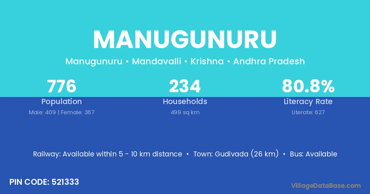 Gudivada (26 km) is the nearest town to Manugunuru village for major economic activities and is located approximately 26 km away.