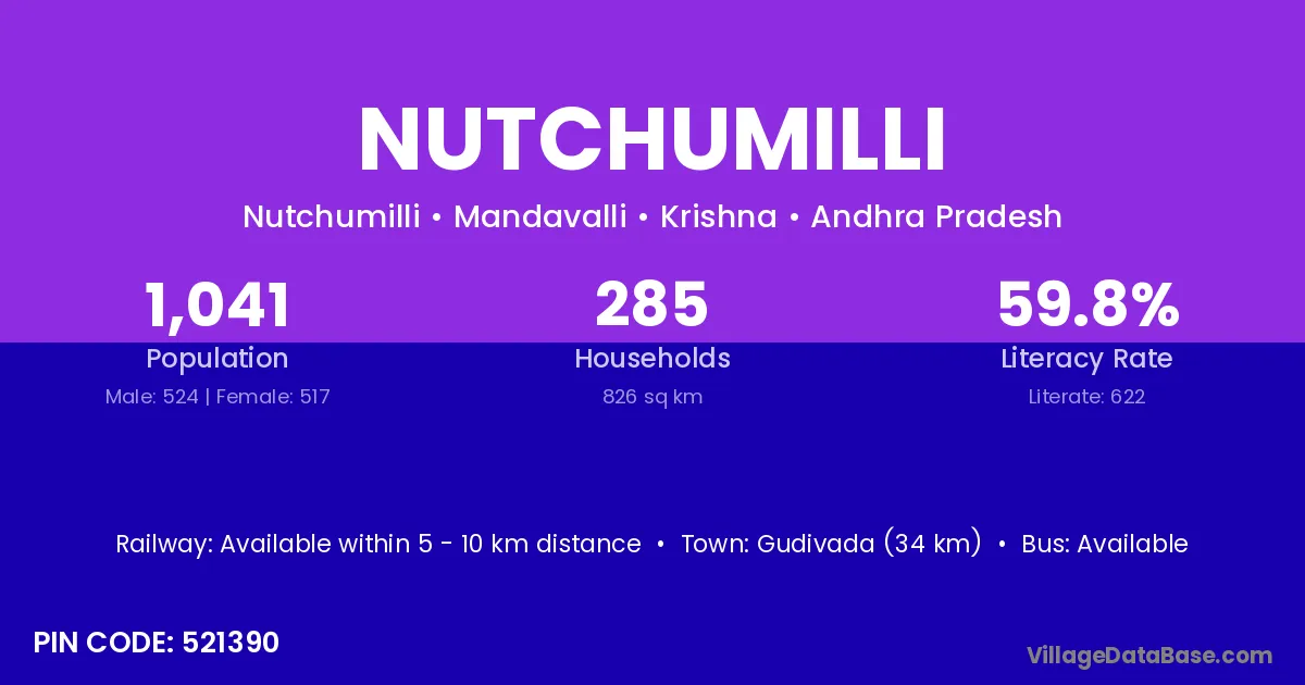 Gudivada (34 km) is the nearest town to Nutchumilli village for major economic activities and is located approximately 34 km away.