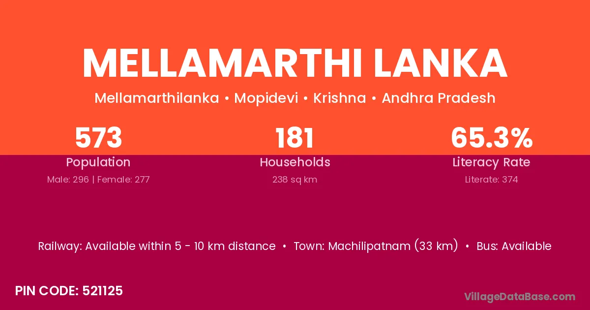 Mellamarthi Lanka village has a total population of 573 people, of which 296 are males and 277 are females.