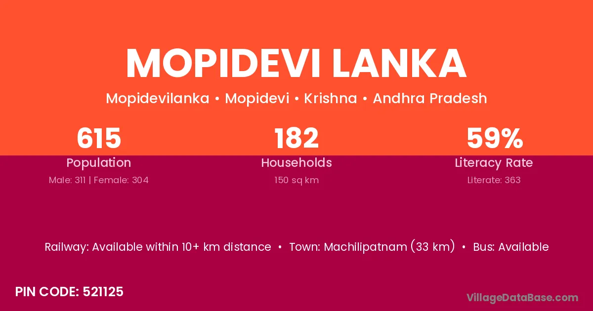 Mopidevi Lanka village has a total population of 615 people, of which 311 are males and 304 are females.