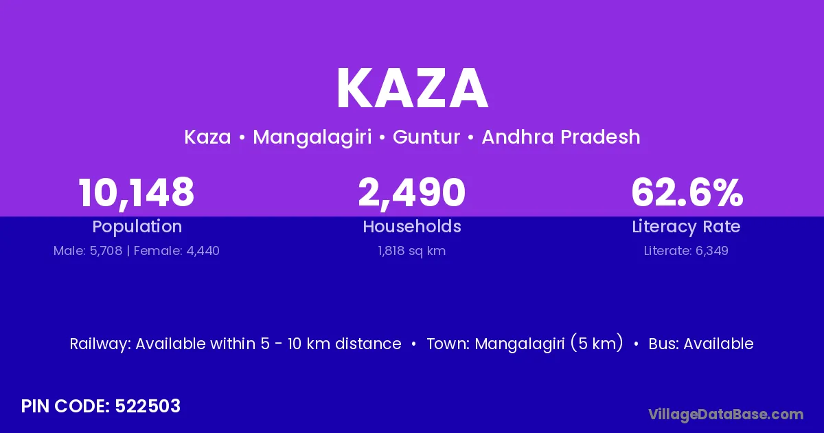 Machilipatnam (19 km) is the nearest town to Kaza village for major economic activities and is located approximately 19 km away.