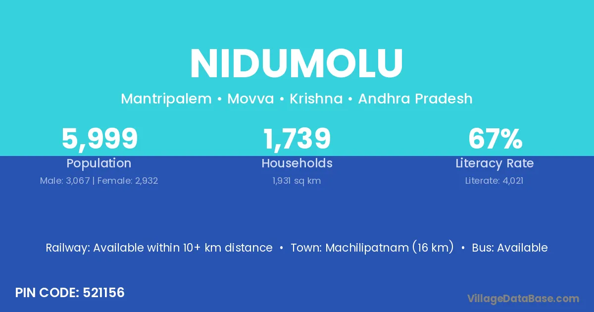 Machilipatnam (16 km) is the nearest town to Nidumolu village for major economic activities and is located approximately 16 km away.