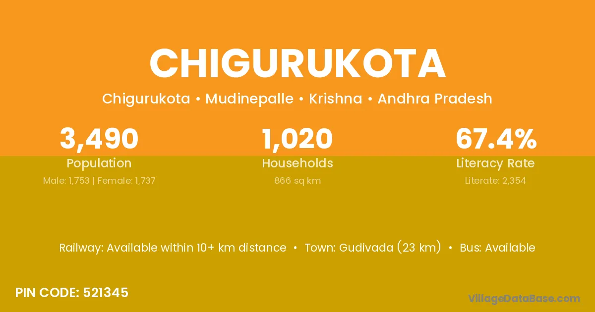 Gudivada (23 km) is the nearest town to Chigurukota village for major economic activities and is located approximately 23 km away.