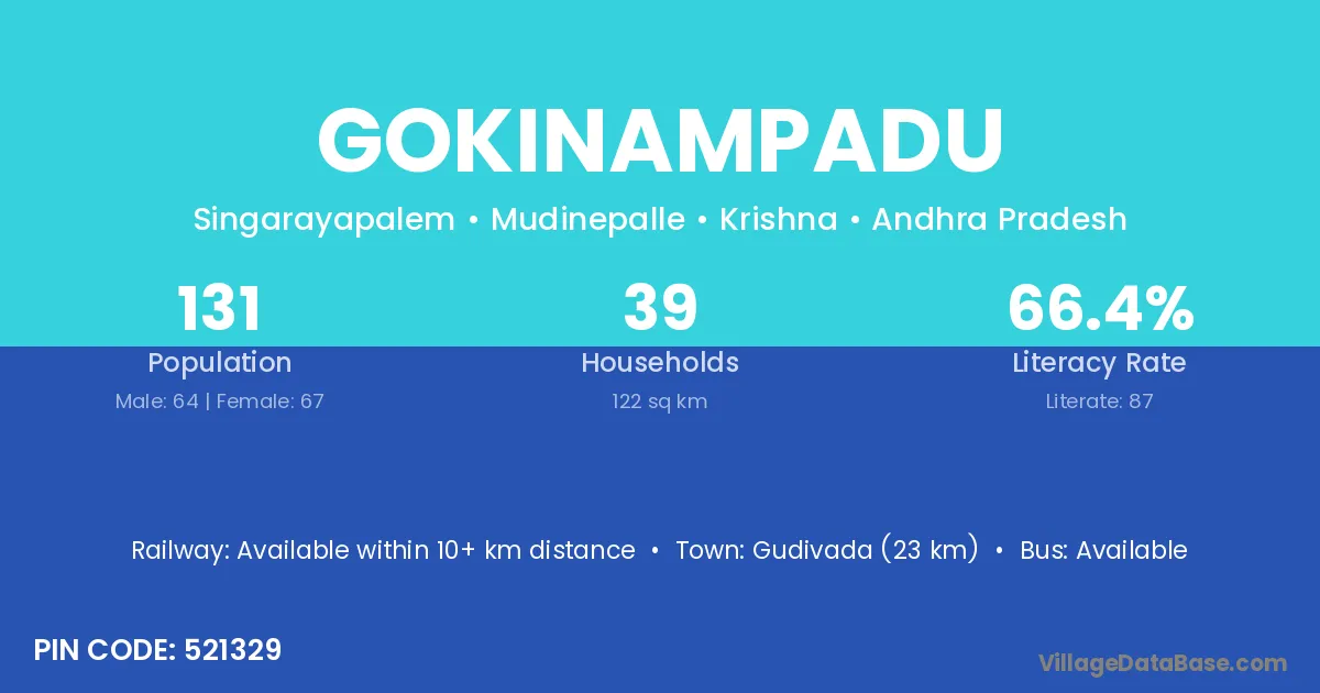 Gokinampadu village has a total population of 131 people, of which 64 are males and 67 are females.