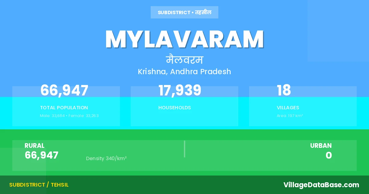 According to the 2011 census The total area of Mylavaram Mandal is 197 km², with a population of 66947 people. The population density is 340 inhabitants per square kilometre, and there are approximately 17939 houses in the sub district.