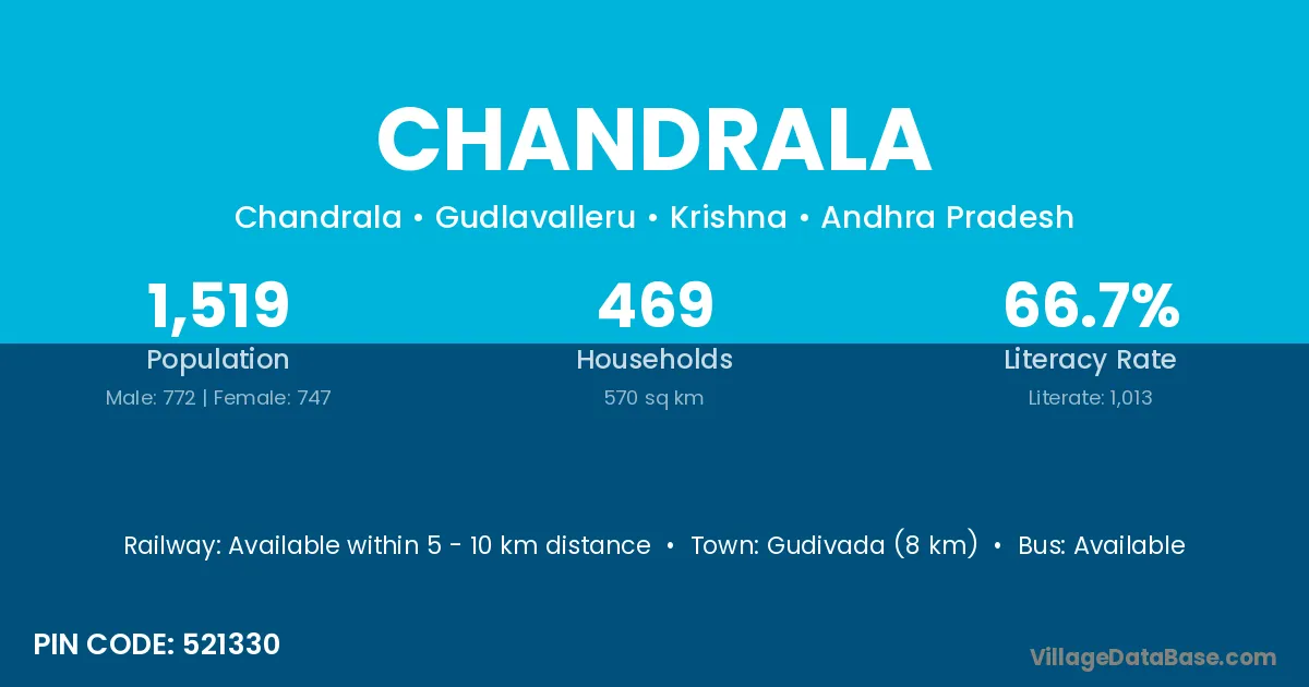 Nuzvid (24 km) is the nearest town to Chandrala village for major economic activities and is located approximately 24 km away.