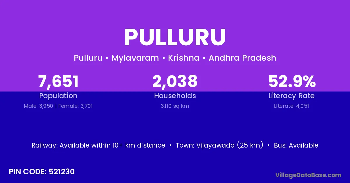 Vijayawada (25 km) is the nearest town to Pulluru village for major economic activities and is located approximately 25 km away.