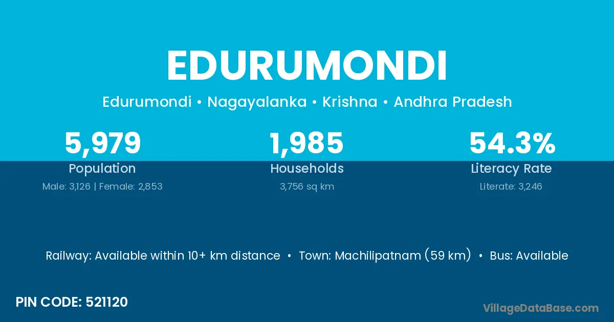Machilipatnam (59 km) is the nearest town to Edurumondi village for major economic activities and is located approximately 59 km away.