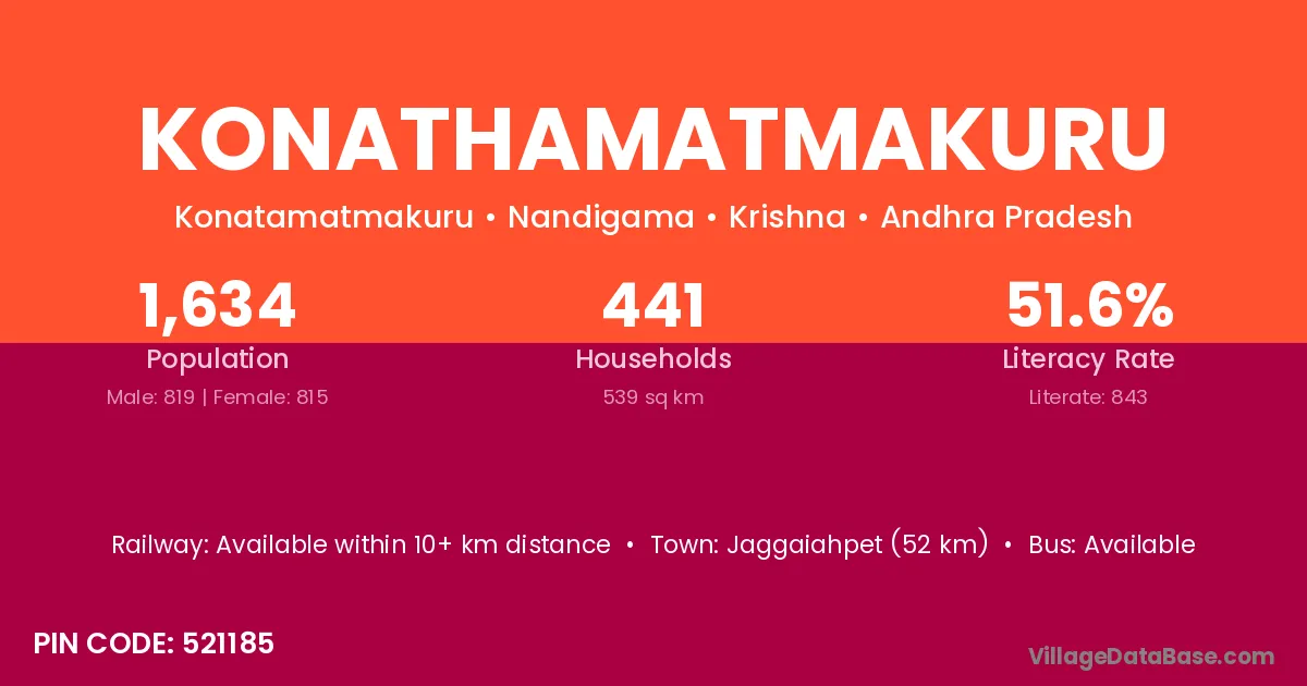 Jaggaiahpet (52 km) is the nearest town to Konathamatmakuru village for major economic activities and is located approximately 52 km away.
