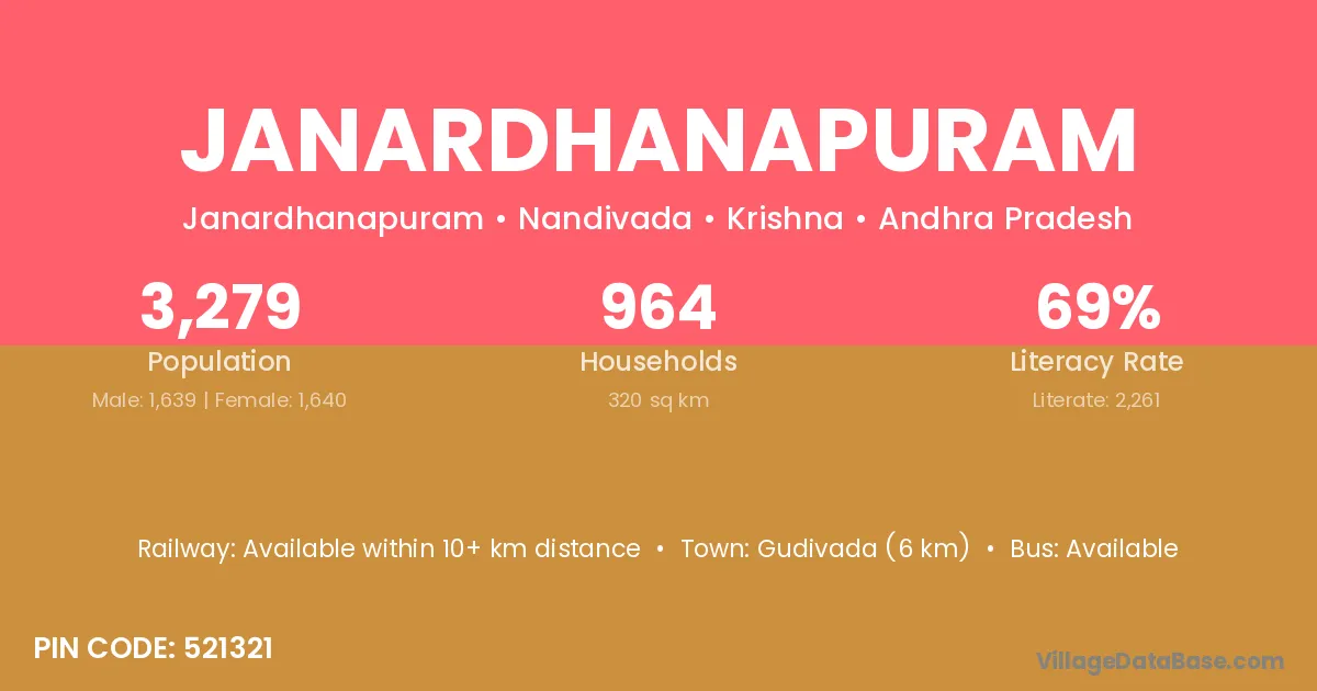 Gudivada (6 km) is the nearest town to Janardhanapuram village for major economic activities and is located approximately 6 km away.