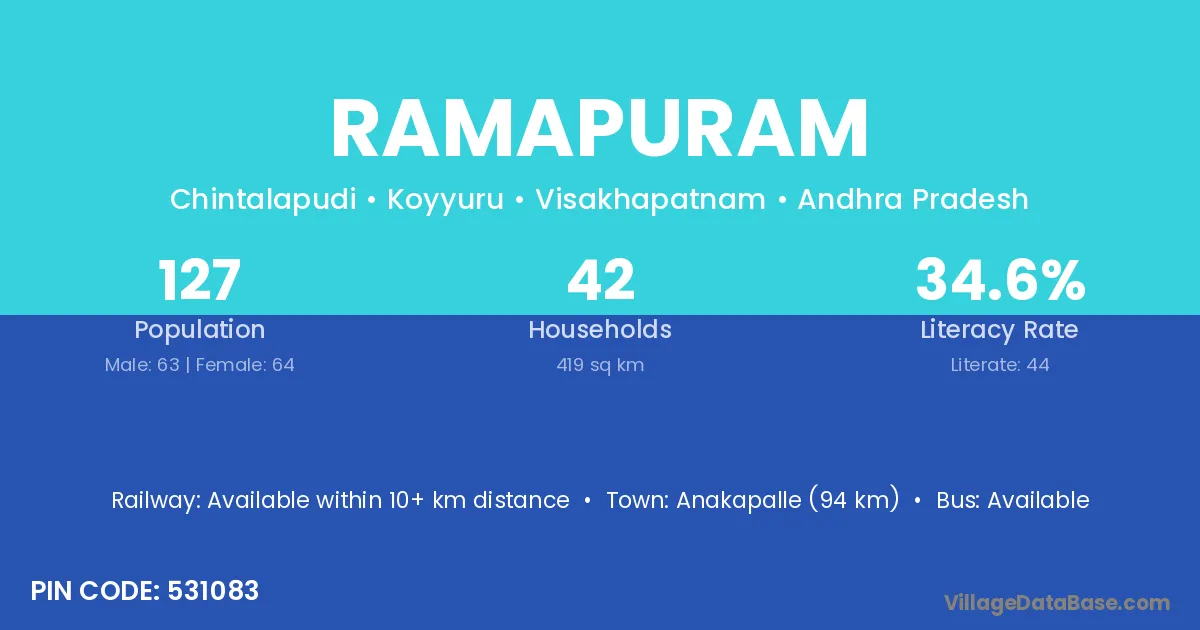 The literacy rate of Ramapuram village is 61.96%. Male literacy stands at 63.14% and female literacy at 60.69%.