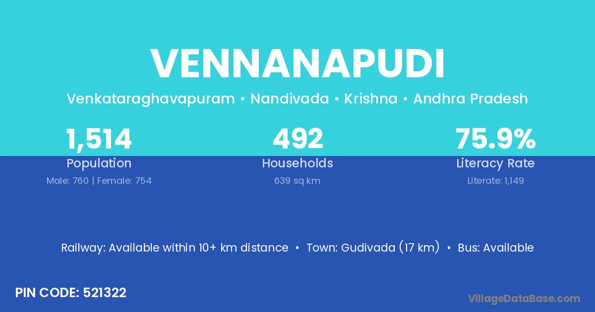 Gudivada (17 km) is the nearest town to Vennanapudi village for major economic activities and is located approximately 17 km away.