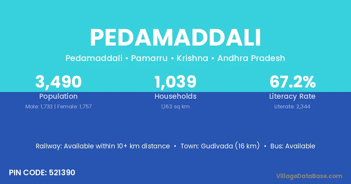 Gudivada (16 km) is the nearest town to Pedamaddali village for major economic activities and is located approximately 16 km away.