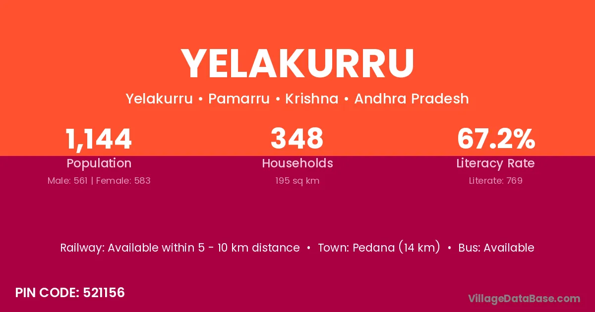 Pedana (14 km) is the nearest town to Yelakurru village for major economic activities and is located approximately 14 km away.