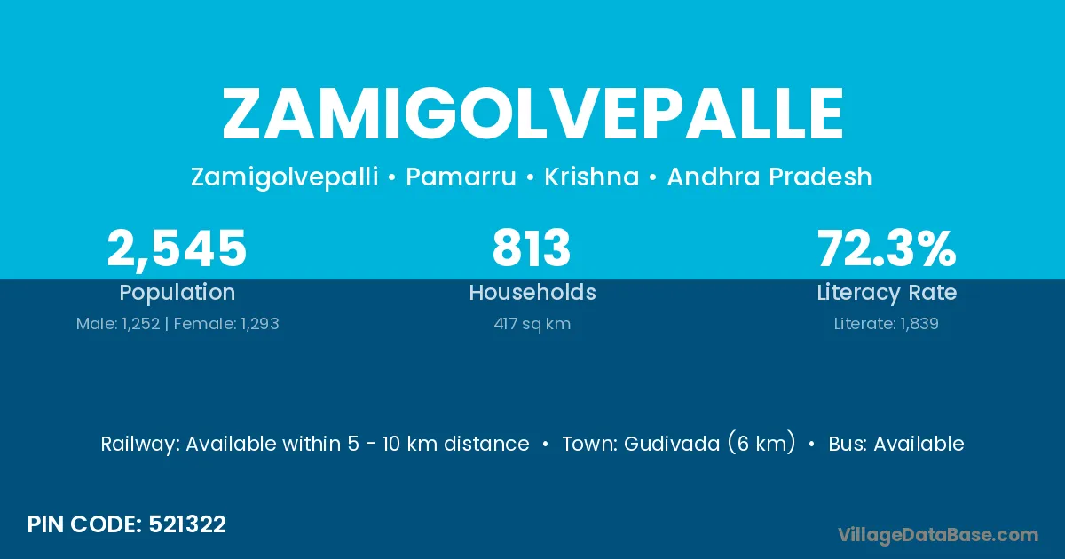 Gudivada (6 km) is the nearest town to Zamigolvepalle village for major economic activities and is located approximately 6 km away.