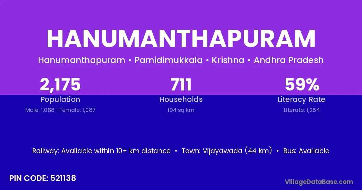 Vijayawada (44 km) is the nearest town to Hanumanthapuram village for major economic activities and is located approximately 44 km away.