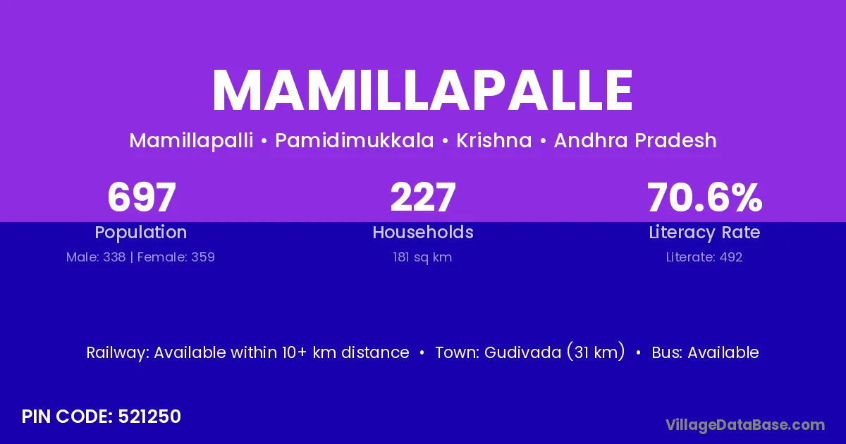 Gudivada (31 km) is the nearest town to Mamillapalle village for major economic activities and is located approximately 31 km away.