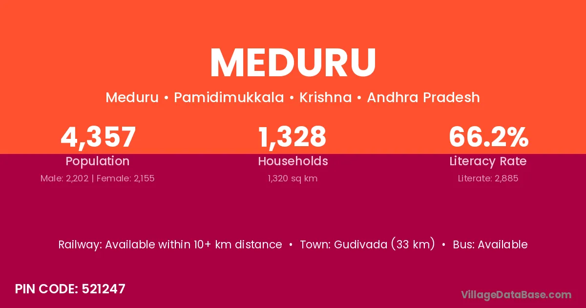 Gudivada (33 km) is the nearest town to Meduru village for major economic activities and is located approximately 33 km away.