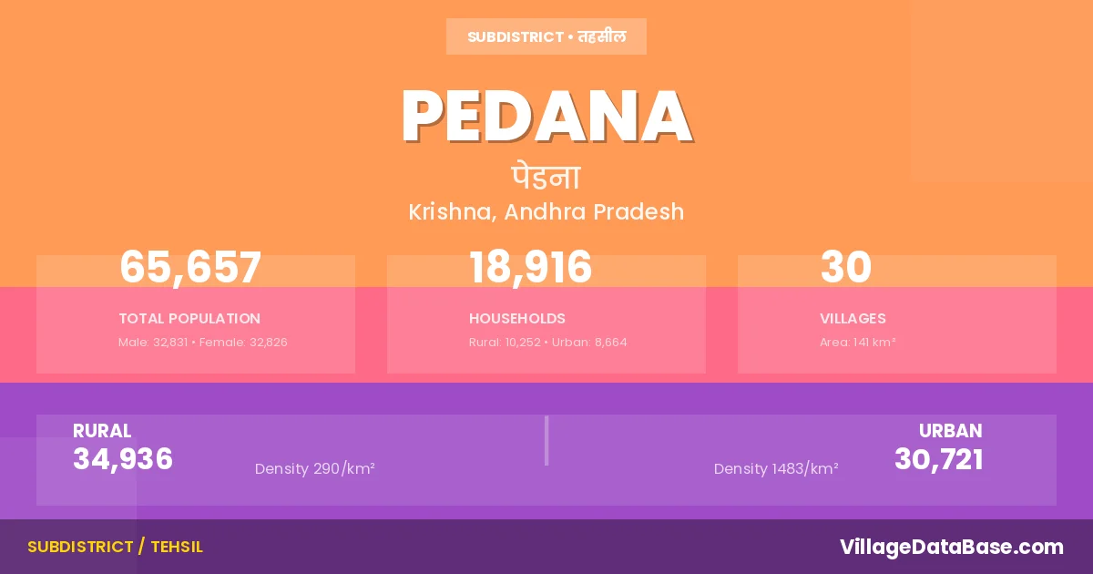 According to the 2011 census The total area of Pedana Mandal is 141 km², with a population of 65657 people. The population density is 466 inhabitants per square kilometre, and there are approximately 18916 houses in the sub district.