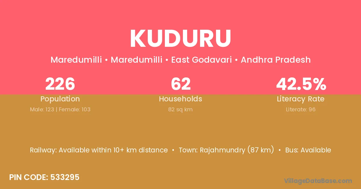 The literacy rate of Kuduru village is 51.59%. Male literacy stands at 57.97% and female literacy at 45.35%.