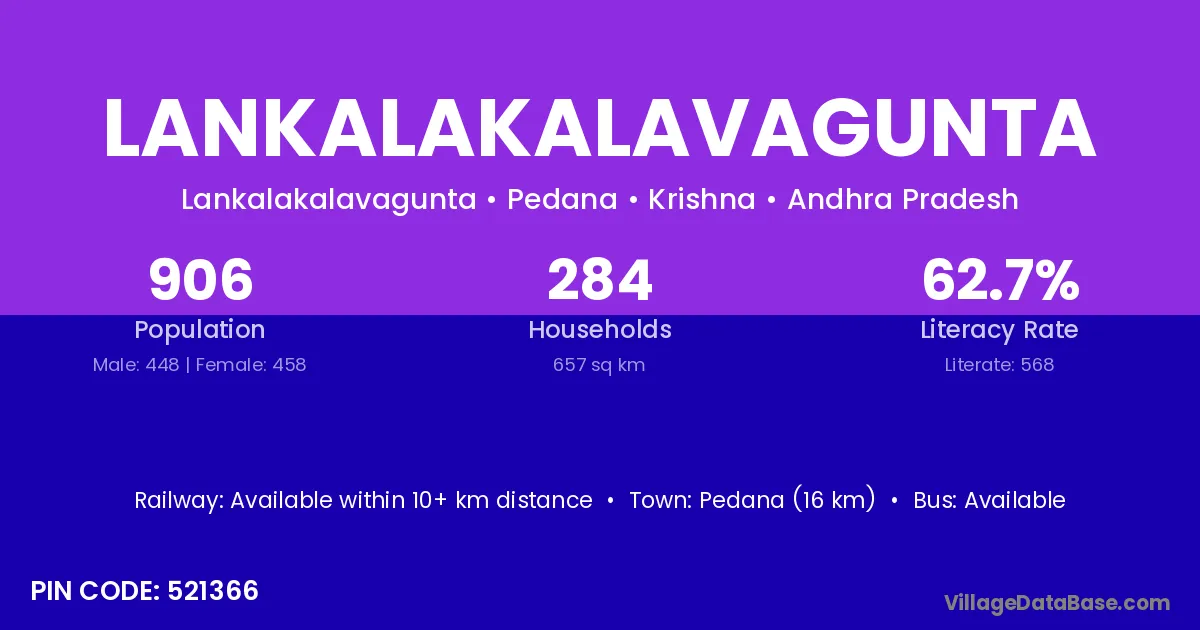 Pedana (16 km) is the nearest town to Lankalakalavagunta village for major economic activities and is located approximately 16 km away.