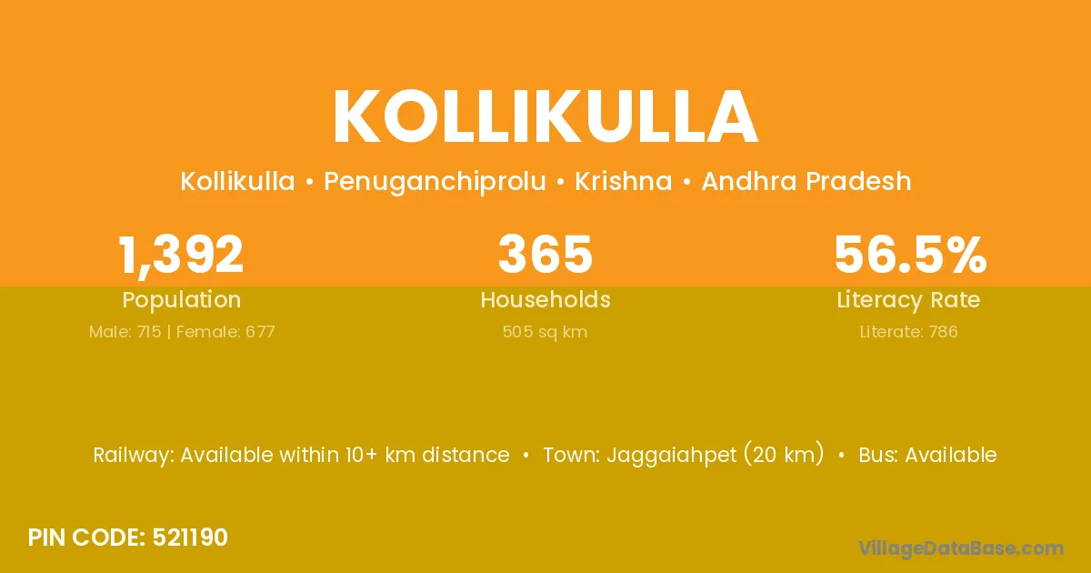 Jaggaiahpet (20 km) is the nearest town to Kollikulla village for major economic activities and is located approximately 20 km away.