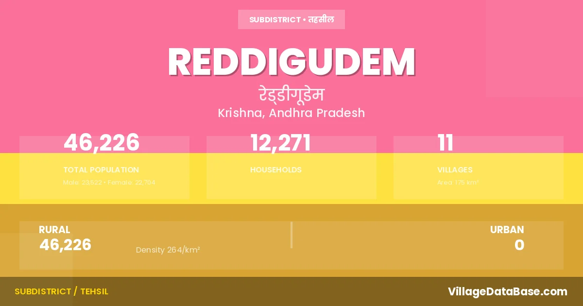 According to the 2011 census The total area of Reddigudem Mandal is 175 km², with a population of 46226 people. The population density is 264 inhabitants per square kilometre, and there are approximately 12271 houses in the sub district.
