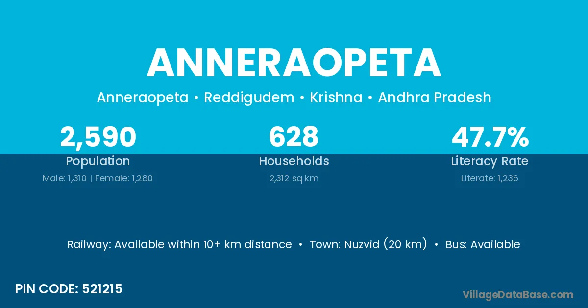 Nuzvid (20 km) is the nearest town to Anneraopeta village for major economic activities and is located approximately 20 km away.
