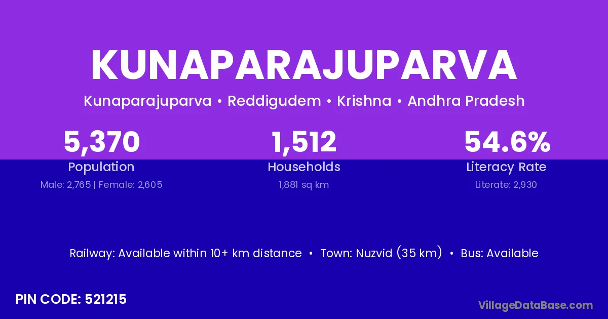 Nuzvid (35 km) is the nearest town to Kunaparajuparva village for major economic activities and is located approximately 35 km away.