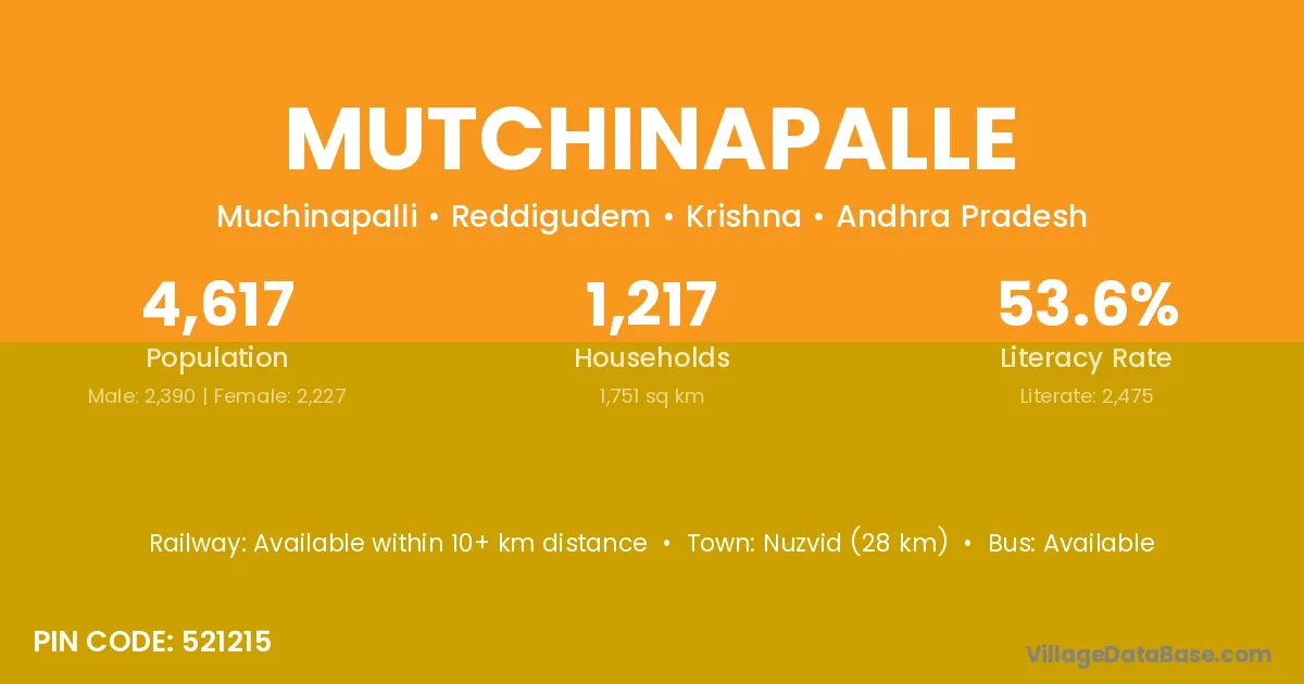 Nuzvid (28 km) is the nearest town to Mutchinapalle village for major economic activities and is located approximately 28 km away.