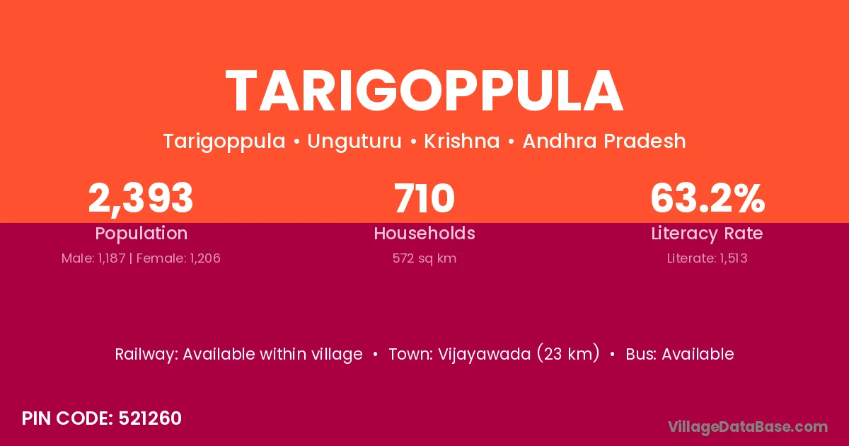 Vijayawada (23 km) is the nearest town to Tarigoppula village for major economic activities and is located approximately 23 km away.