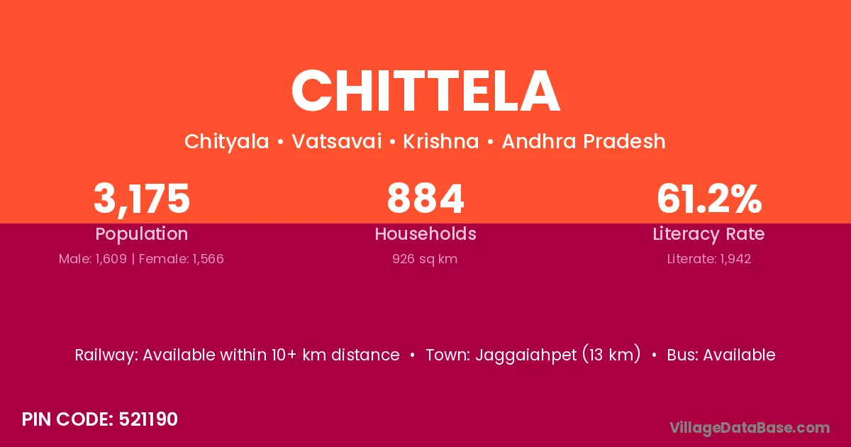 Jaggaiahpet (13 km) is the nearest town to Chittela village for major economic activities and is located approximately 13 km away.