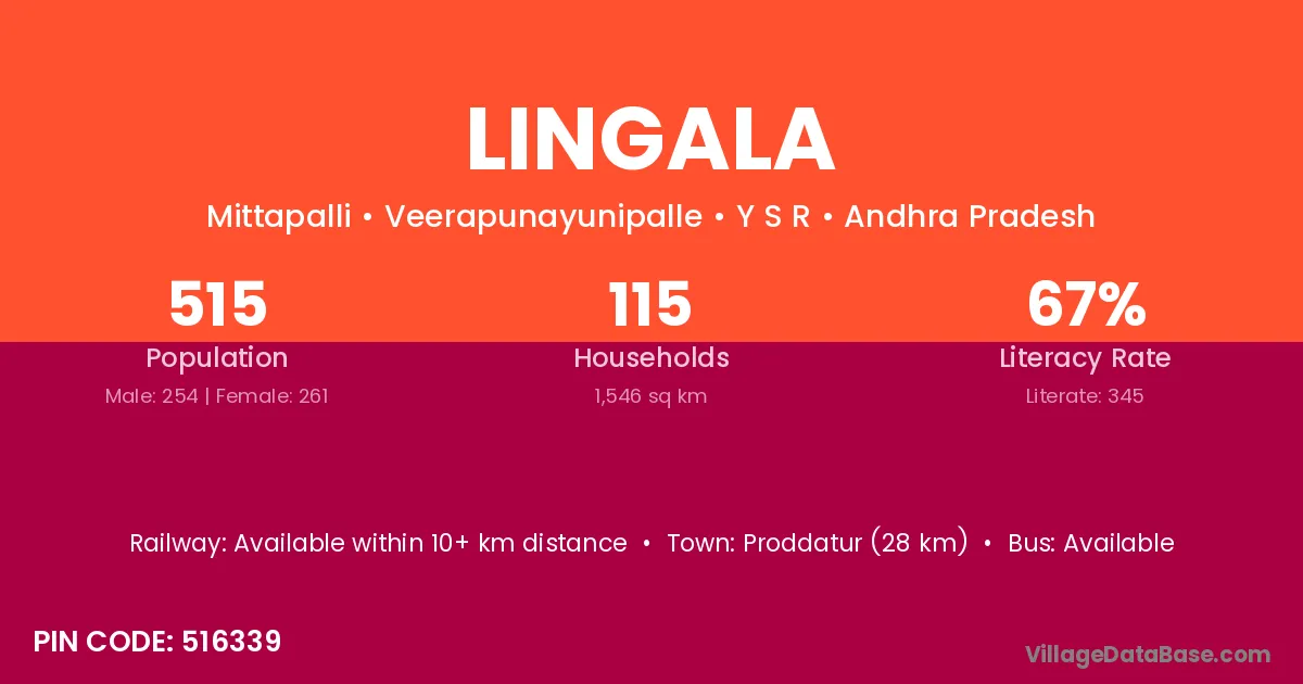 Jaggaiahpet (16 km) is the nearest town to Lingala village for major economic activities and is located approximately 16 km away.