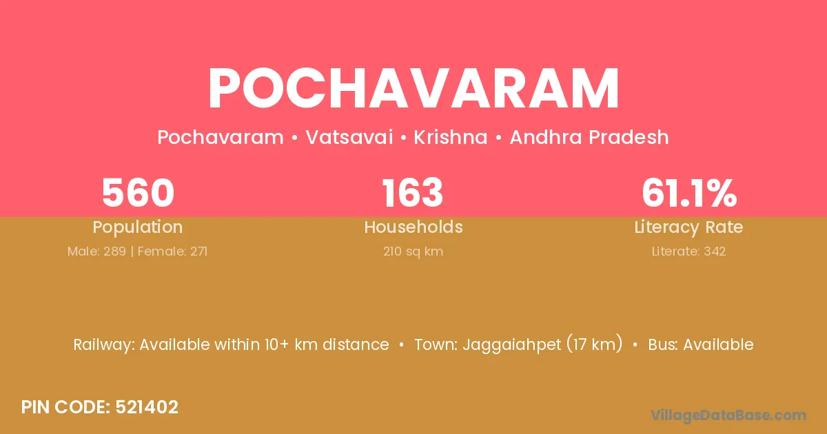 Jaggaiahpet (17 km) is the nearest town to Pochavaram village for major economic activities and is located approximately 17 km away.