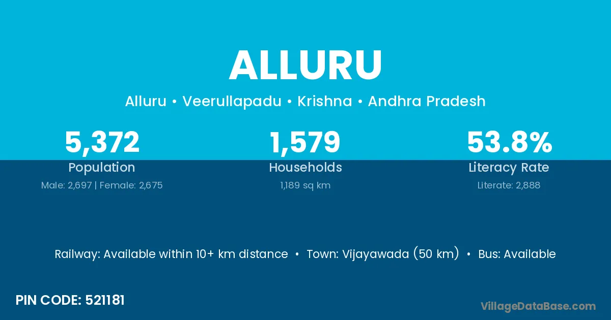 Vijayawada (50 km) is the nearest town to Alluru village for major economic activities and is located approximately 50 km away.