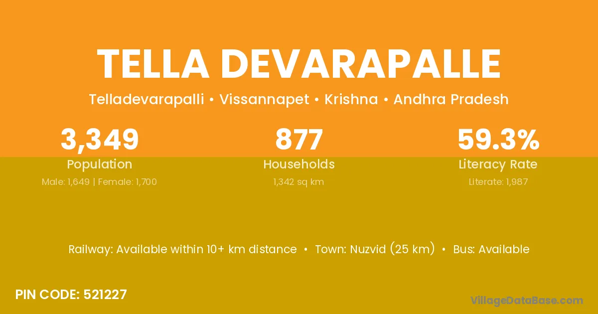 Nuzvid (25 km) is the nearest town to Tella Devarapalle village for major economic activities and is located approximately 25 km away.