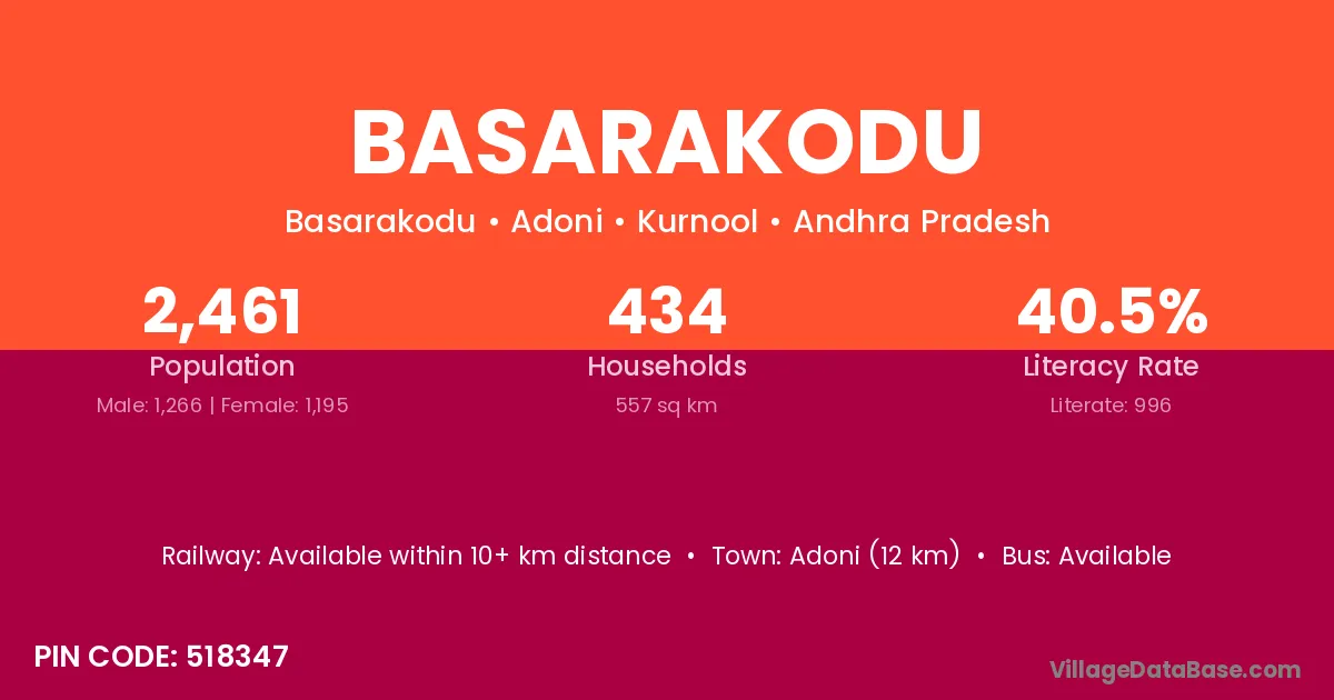 Adoni (12 km) is the nearest town to Basarakodu village for major economic activities and is located approximately 12 km away.