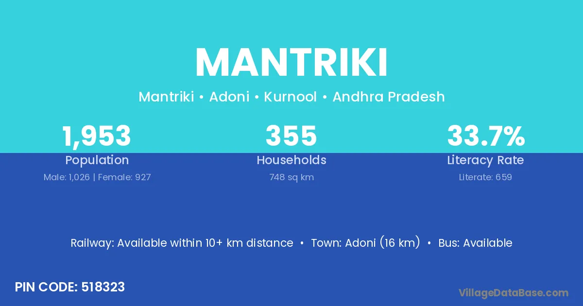 Adoni (16 km) is the nearest town to Mantriki village for major economic activities and is located approximately 16 km away.