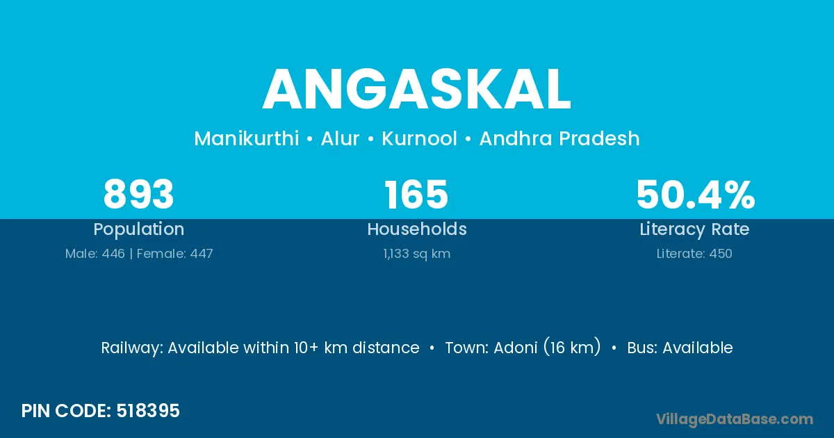 Adoni (16 km) is the nearest town to Angaskal village for major economic activities and is located approximately 16 km away.