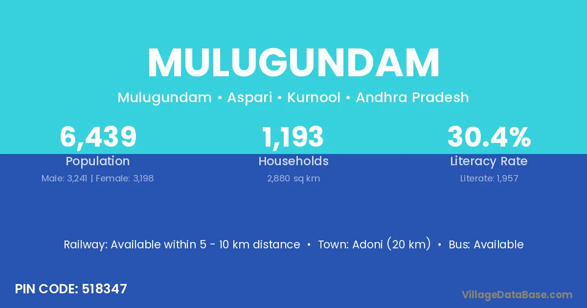 Adoni (20 km) is the nearest town to Mulugundam village for major economic activities and is located approximately 20 km away.