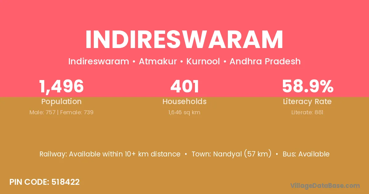 Nandyal (57 km) is the nearest town to Indireswaram village for major economic activities and is located approximately 57 km away.